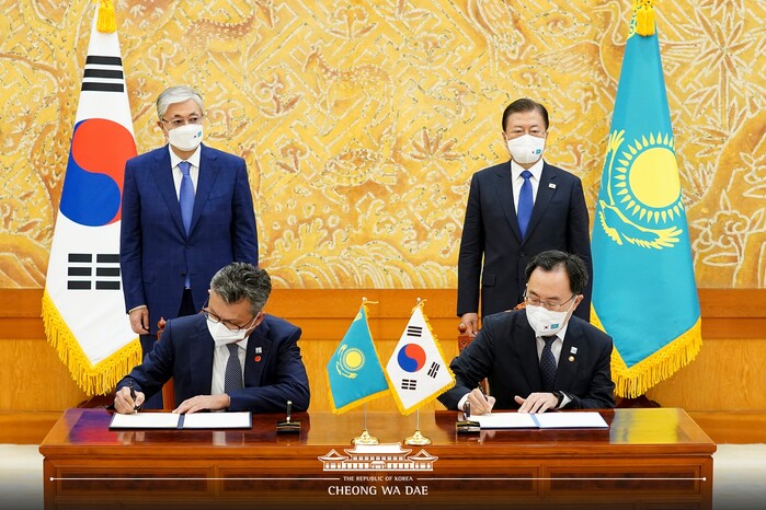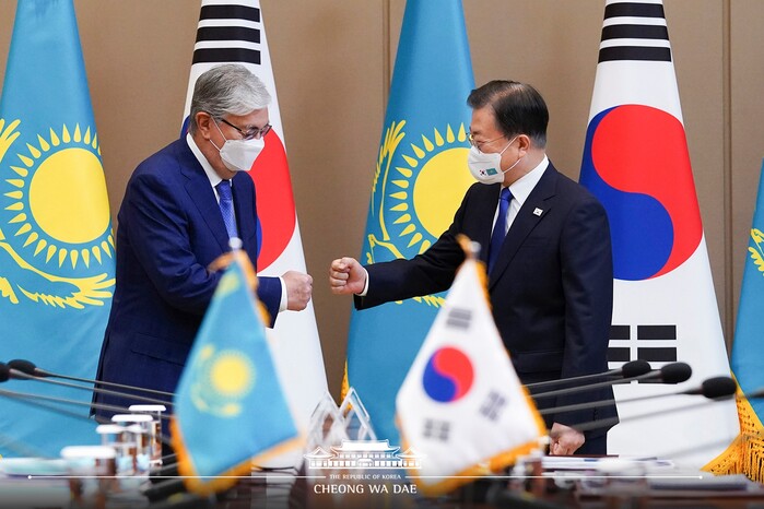 이어 양 정상은 보건 분야 협력에 대해서도 논의했다. 문 대통령은 “우리 PCR 진단검사 기업이 카자흐스탄에 진출하고, 양국 보건부와 감염병 전문가 간 코로나 진단·치료 협력이 이루어지고 있음을 평가한다”면서 “양국이 앞으로도 효과적으로 감염병을 예방·관리하고 대응할 수 있도록, 백신 개발까지 포함하여 긴밀히 협력해 나가기를 희망한다”고 말했다.