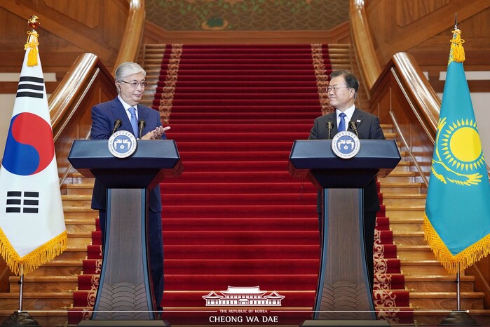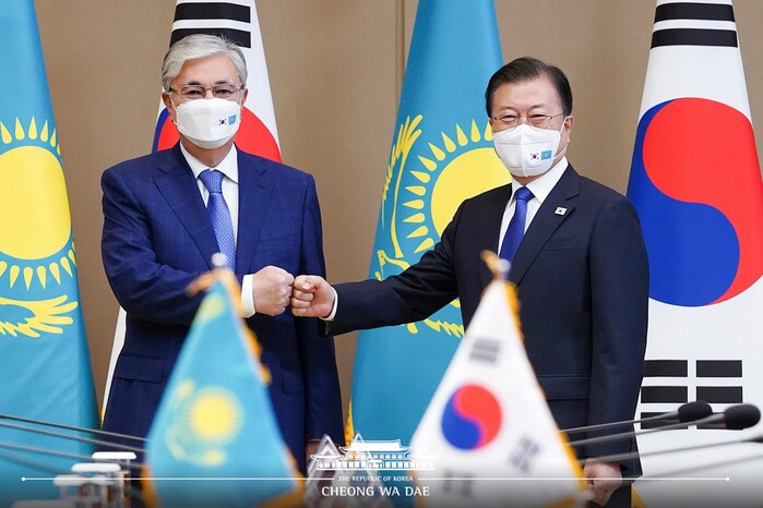 문재인 대통령은 코로나19 이후 처음으로 우리나라를 국빈 방문한 카심-조마르트 토카예프 카자흐스탄 대통령과 17일 청와대에서 정상회담을 갖고 양국의 협력 방안 등을 논의했다. 이번 정상회담은 2년 전인 2019년 4월 정상회담을 통해 쌓은 양 정상 간 우의와 신뢰를 바탕으로 우호적인 분위기에서 진행됐다.