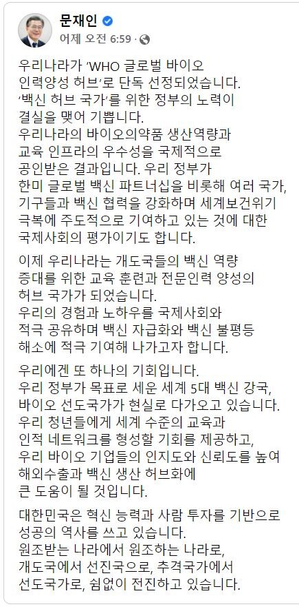 <문재인 대통령의 메시지> 우리나라가 ‘WHO 글로벌 바이오 인력양성 허브’로 단독 선정되었습니다. ‘백신 허브 국가’를 위한 정부의 노력이 결실을 맺어 기쁩니다. 이제 우리나라는 개도국들의 백신 역량증대를 위한 교육 훈련과 전문인력 양성의 허브 국가가 되었습니다. 우리의 경험과 노하우를 국제사회와 적극 공유하며 백신 자급화와 백신 불평등 해소에 적극 기여해 나가고자 합니다. 우리에겐 또 하나의 기회입니다. 우리 정부가 목표로 세운 세계 5대 백신 강국, 바이오 선도국가가 현실로 다가오고 있습니다. 우리 청년들에게 세계 수준의 교육과 인적 네트워크를 형성할 기회를 제공하고, 우리 바이오 기업들의 인지도와 신뢰도를 높여 해외수출과 백신 생산 허브화에 큰 도움이 될 것입니다.