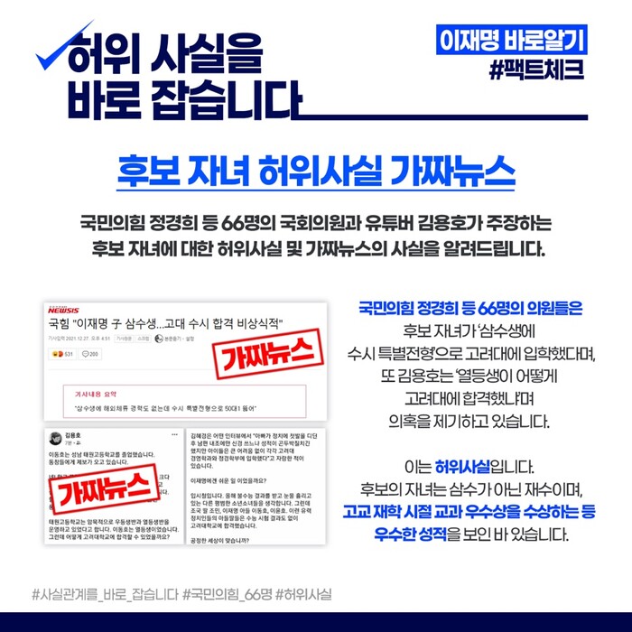 국민의힘 "정경희 등 66명의 국회의원" 과 "유튜버 김용호" 가 주장하는 후보 자녀에 대한 허위사실 및 가짜뉴스의 사실을 알려드립니다.