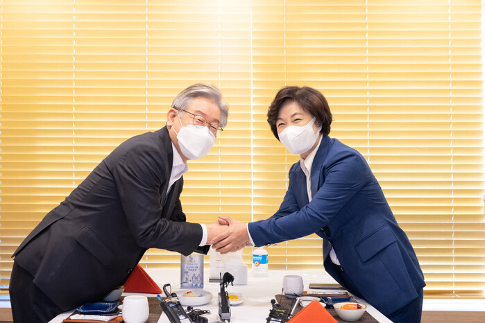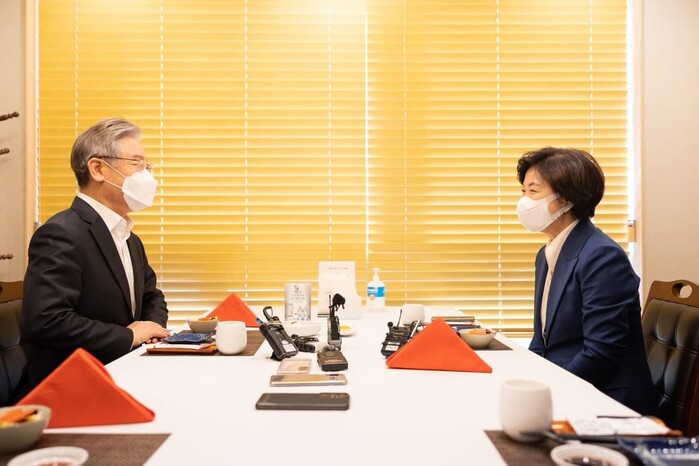 이재명 후보는 27일 서울 여의도에서 추미애 전 법무부 장관과 오찬을 갖고 문재인 정부 성공과 정권 재창출을 위한 협력 방안을 논의했다. 그리고 이 후보의 요청에 따라, 명예선대위원장을 맡기로했다고 이 후보 캠프의 박찬대 수석대변인이 브리핑에서 밝혔다.