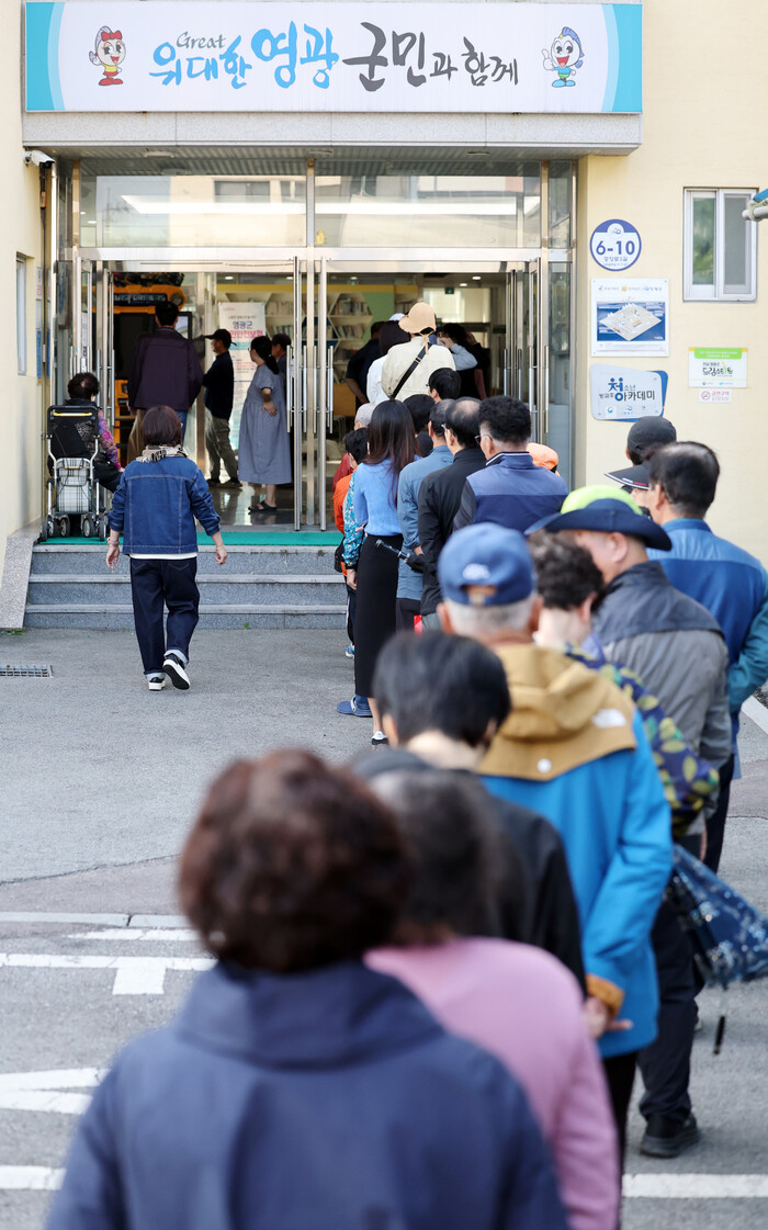 전남 영광군수 재선거 사전투표소인 영광군청소년문화센터에는 이른 아침부터 쉴 새 없이 몰려드는 유권자들로 투표소 밖까지 30여m의 대기 줄이 만들어졌다.
