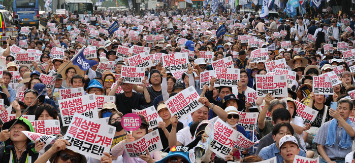 참가자들은 '채상병 특검법 거부 강력 규탄', '민생 개혁입법 즉각 수용' 등 문구가 적힌 손팻말을 들고 광화문역 7번 출구 앞부터 새문안교회 인근까지 260여m 구간 4개 차로를 가득 메웠다.
