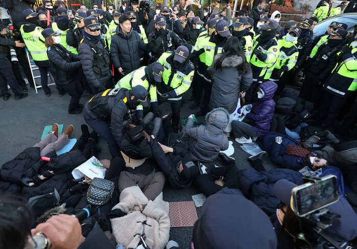 | ▲ 2일 한남동 관저 정문 앞 도로에 누워있는 내란수괴 지지자들을 경찰이 해산시키고 있다. (사진=연합뉴스) |