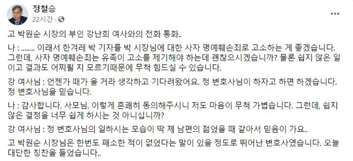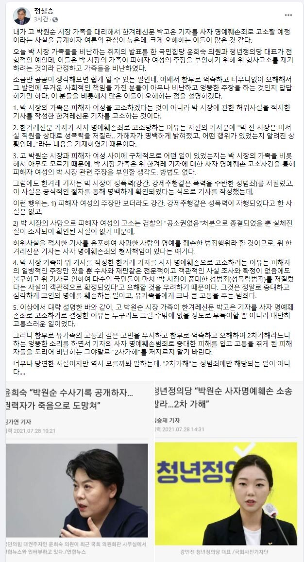 법무법인 THE FIRM 대표변호사 정철승 변호사가 한겨레 박 기자를 "박 시장님에 대한 사자 명예훼손죄" 로 고소한다고 박원순 전 시장님의 부인 강난희 여사와 전화 통화를 하였다. 한겨레 기자는 박 시장이 성폭력(강간, 강제추행같은 폭력을 수반한 성범죄)를 저질렀고, 이 사실은 공식적인 절차를 통해 명백하게 확인되었다는 식으로 기사를 작성하였기 때문이다.