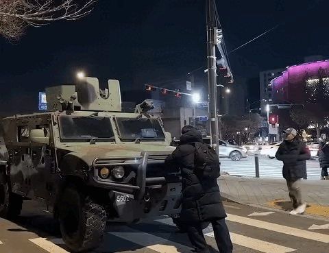 | ▲ 불법 계엄 당일 시민이 장갑차를 막고 있다. (출처=커뮤니티) |