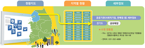 지역·업종별 민간 유통 전문조직인 소셜벤더를 육성하고 운영을 통해 체계적이고 지속적인 판로지원 기반을 마련하며, 사회적경제조직의 판로개척과 판로지원정책 수립 등에 활용할 수 있도록 지역별 수요·공급 정보를 지도 형태로 제공한다.
