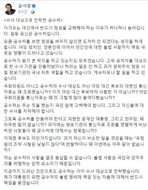 국민의힘 윤석열 대선후보 역시 자신의 페이스북을 통해 “공수처가 수사대상으로 전락했다”며 반드시 정권을 교체해야 하는 이유 중 일등공신이 공수처라고 강조했다.