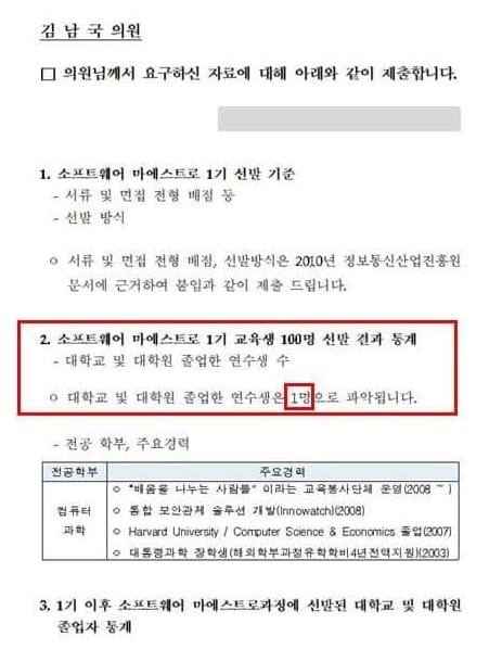 김남국 의원은 정보통신기획평가원으로부터 공식 답변을 받았다. 2010년도 제1기 SW 마에스트로 과정에서 대학교 및, 대학원을 졸업한 연수생은 1명으로 파악된다는 내용이다. 이를 뒷받침하는 진술도 뒤따르고 있다.