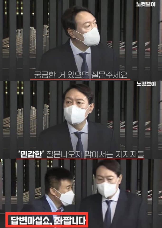 그때 지지자로 보이는 한 남자가 불쑥 앞으로 나와 몸으로 카메라를 막아섰다. 또다른 지지지로 보이는 남자가 윤 전 총장에게 다가가서 “답변 마십쇼, 좌팝니다”라고 말하는 장면이 '노컷' 등 다른 취재기자의 앵글에 잡혔다.