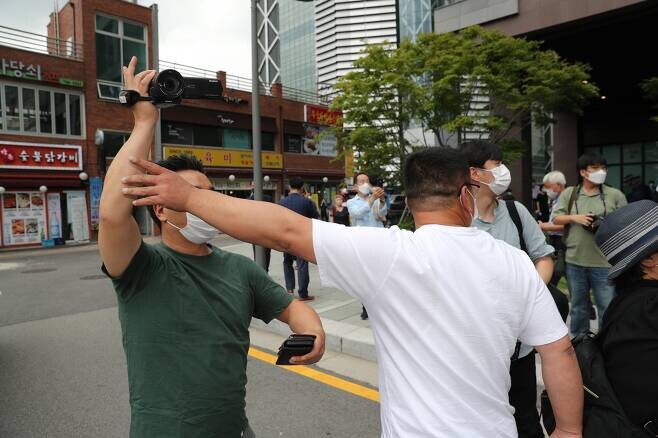 | ▲ 윤석열 전 검찰총장의 지지자가 서울의소리 이명수 기자의 카메라를 막으며 질문을 못하게 위협하면서 몸으로 밀치고 있다. 국회사진기자단 |