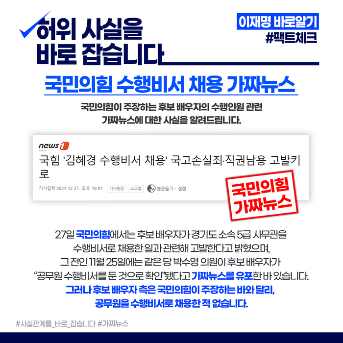 27일 국민의힘에서는 후보 배우자가 "경기도 소속 5급 사무관을 수행비서" 로 채용한 일과 관련해 고발한다고 밝혔으며, 그 전인 11월 25일에는 같은 당 박수영 의원이 후보 배우자가 “공무원 수행비서를 둔 것으로 확인”됐다고 가짜뉴스를 유포한 바 있습니다.