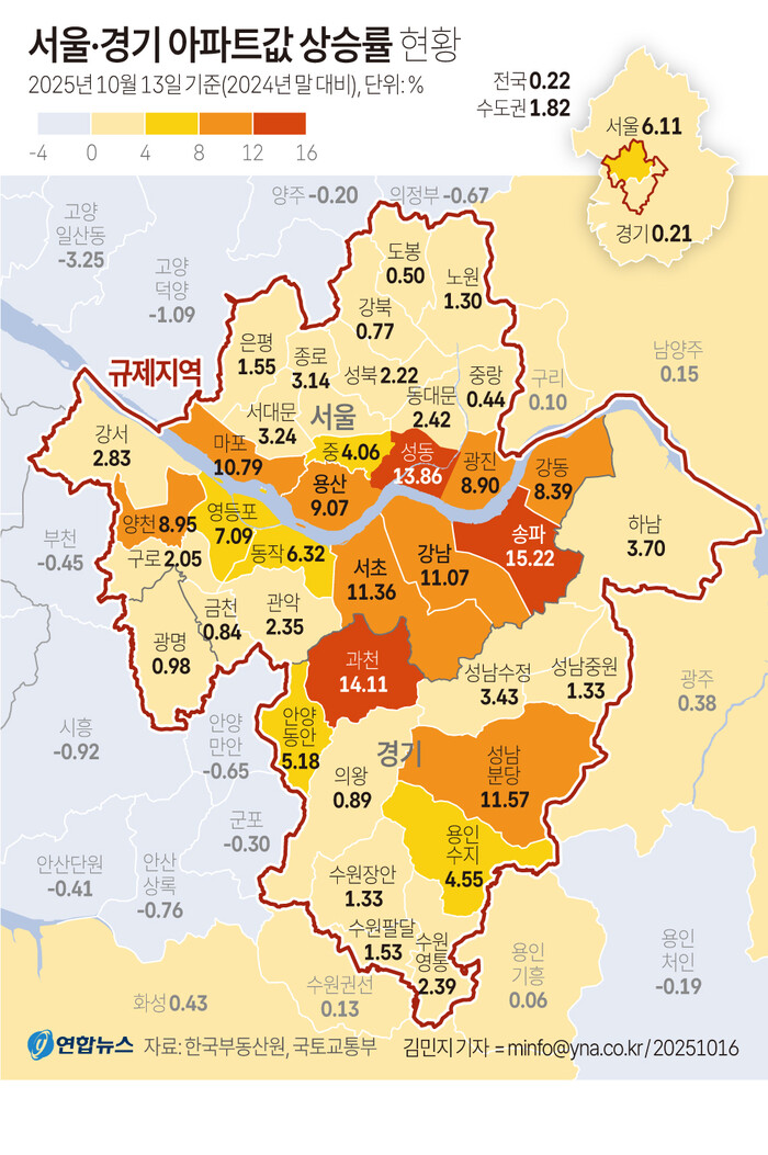 | ▲ 정부가 최근 서울과 경기도 일부 지역의 집값 과열에 대응하고자 서울 전역과 경기도 12개 지역을 규제지역과 토지거래허가구역으로 지정한다. 현행 서울 강남 3구(서초·강남·송파구)와 용산구를 포함한 서울 25개 자치구 전체와 경기도 12개 지역(과천시, 광명시, 성남시 분당구·수정구·중원구, 수원시 영통구·장안구·팔달구, 안양시 동안구, 용인시 수지구, 의왕시, 하남시)이 조정대상지역과 투기과열지구로 묶여 규제지역으로 추가된다. 규제지역 지정 효력은 16일부터 발생한다. 사진은 15일 경기도 수원시 영통구 일대 아파트 단지 모습. 2025.10.15 (사진=연합뉴스) |