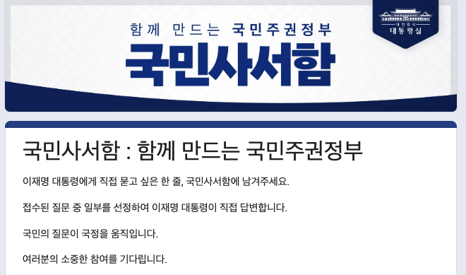 그러면서 "경제, 민생, 사회, 정치, 외교, 안보까지 국정 전반에 대한 질문을 ‘국민사서함’에 남겨달라. 국민적 관심과 공감이 큰 사안에 대해서는 대통령이 직접 답변 드릴 예정"이라고 답했다.