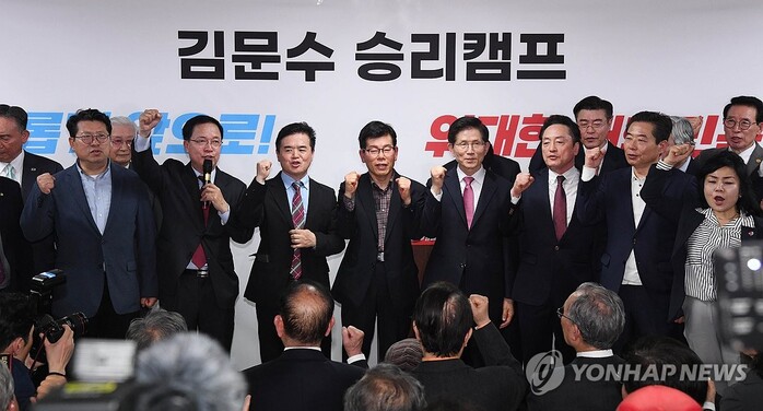 이날 국민의힘 원외 당협위원장 37명도 캠프 사무소에서 김 후보 지지를 선언했다.