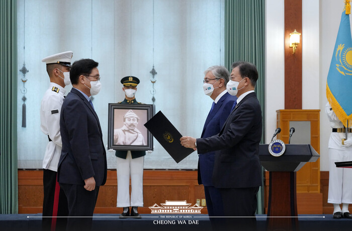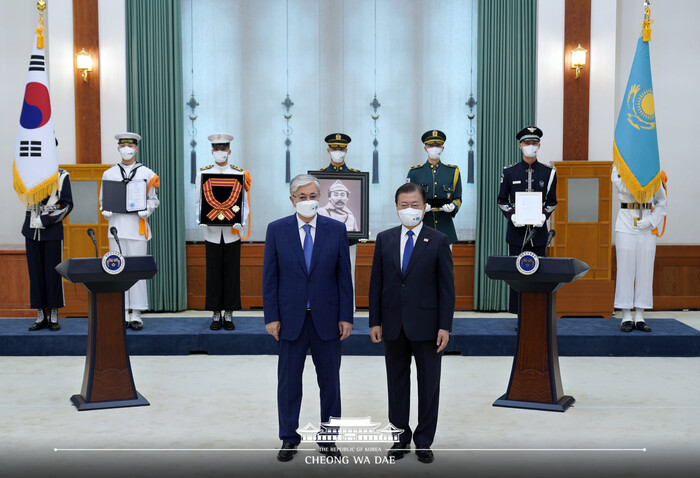 문재인 대통령은 오늘 오전, 故 홍범도 장군 건국장 대한민국장 훈장 추서식을 거행했다. 이 자리에는 카심-조마르트 토카예프 카자흐스탄 대통령이 함께했다.