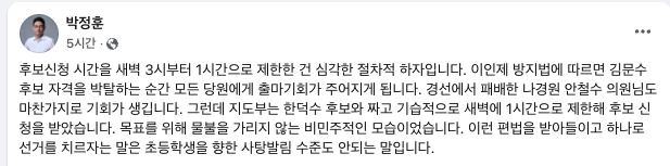 박정훈 국민의힘 의원도 페이스북에 “(대통령) 후보 신청 시간을 새벽 3시부터 1시간으로 제한한 건 심각한 절차적 하자”라는 글을 올렸다. 박 의원은 “‘이인제 방지법’에 따르면 김문수 후보의 자격을 박탈하는 순간 모든 당원에게 출마 기회가 주어지게 된다. 경선에서 패배한 나경원·안철수 의원도 마찬가지로 기회가 생긴다”며 “그런데 지도부는 한덕수 후보와 짜고 기습적으로 새벽에 1시간으로 제한해 후보 신청을 받았다. 목표를 위해 물불을 가리지 않는 비민주적인 모습”이라고 비판했다.