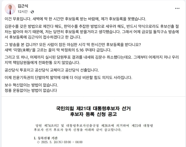 당장 김근식 국민의힘 송파병 당협위원장이 이날 페이스북에 이런 글을 올려 ‘절차적 하자’ 때문에 대선 후보로 등록할 기회를 놓쳤다고 문제 제기에 나섰다. 김 의원 뿐만 아니라, 박정훈 의원과 최재형 전 의원도 새벽 3시부터 단 한 시간만 후보 등록을 받은 건 “심각한 절차적 하자”로 “무효”란 비판에 가세했다.