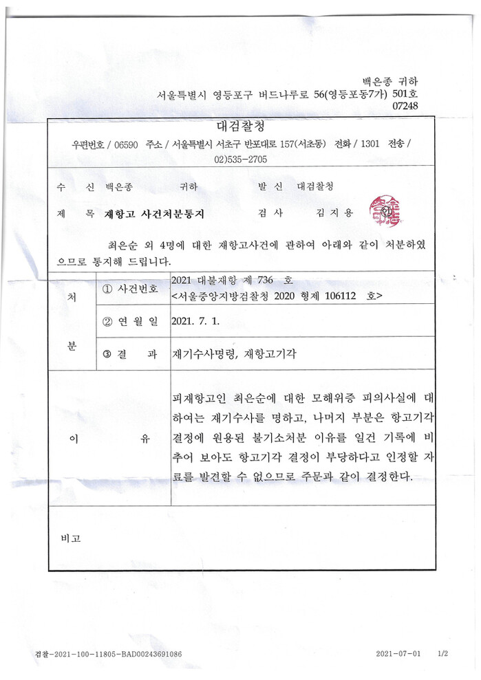 그래서 서로 맞고소하는 법정 싸움이 벌어졌는데, 최은순 씨는 무혐의 처리가 되고 정대택 씨는 강요, 위증교사 등 혐의로 총 3년의 징역을 살아야 했다. 그런데 최은순 씨가 무혐의 처리된 사건 중 가장 중요한 모해위증 사건에 대한 최종 재항고에서 대검이 재수사를 지시하게 된 거다.