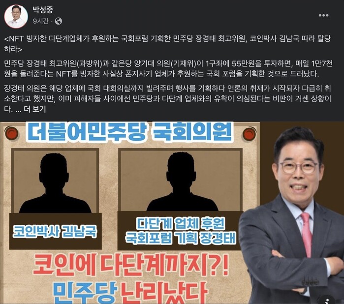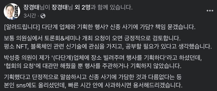NFT(대체불가토큰)을 빙자한 다단계 금융사기(폰지사기)업체가 후원하는 국회 포럼을 기획했다는 의혹이다. 이에 장 최고의원은 "행사를 주관하거나 기획하지 않았다"고 박 의원의 주장을 반박했다.