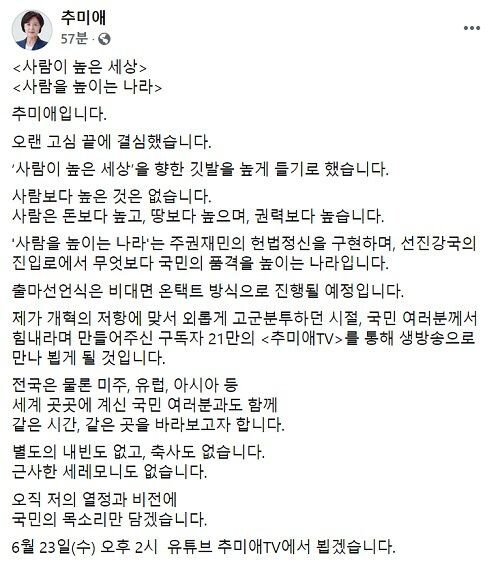 추 전 장관은 “오랜 고심 끝”에 결심했다면서 “사람이 높은 세상”을 향한 깃발을 높게 들기로 했다고 밝혔다. 이어 그는 “사람보다 높은 것은 없다”라면서, 사람은 돈보다 높고, 땅보다 높으며, 권력보다 높다고 의미심장하게 말했다.