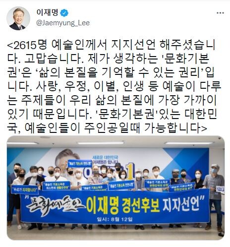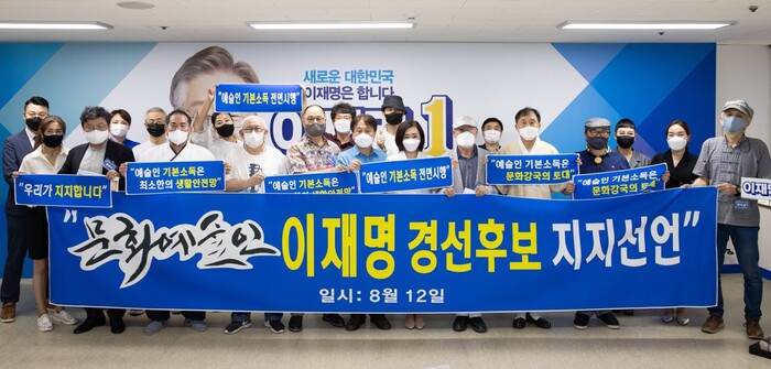 문화예술인 2615명이 12일 오후 서울 여의도 열린캠프에서 더불어민주당 유력 대권주자인 이재명 경기도지사에 대한 지지를 선언했다. 이날 지지 선언식에는 김준권 한국목판문화원장, 이재무 시인, 조경훈 한국애니메이션산업회장, 강은일 해금 솔리스트, 김대균한국전통연희단체총연합회 이사장, 소프라노 박소은씨, 가수 리아씨, 공연기획자 백형기씨 등이 참석했다.