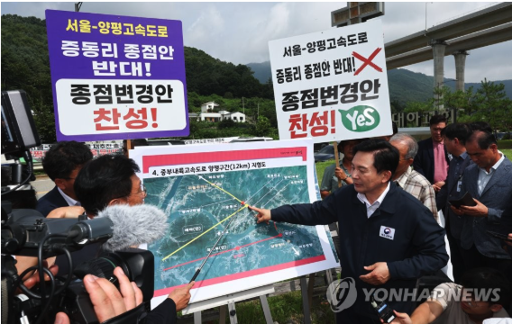 앞서 정치권에서는 국토부가 예비타당성조사를 거쳐 나온 기존 양서면 종점을 타당성조사를 통해 강상면으로 변경한 데 대해 강상면 일대에 땅을 가진 김건희 여사 일가에게 특혜를 준 것 아니냐는 의혹이 제기됐다.