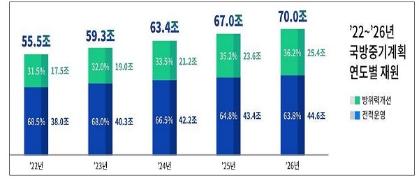 특히 첨단과학기술군 육성에 중점을 둬 방위력개선비 비중이 2021년 32.2%에서 2026년 36.3%로 4.0%p 크게 증가했다.