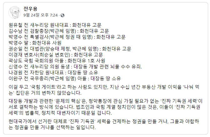 대장동 개발과 관련한 ‘문제의 핵심’은, 청약통장에 관심 가질 필요가 없는 ‘진짜 기득권 세력’이 서로 결탁하는 방식에 있습니다. 법조인과 국힘 계열 정치인이 많은 것은, 이들이 ‘진짜 기득권 세력’의 법률적, 정치적 대변자이기 때문일 겁니다.