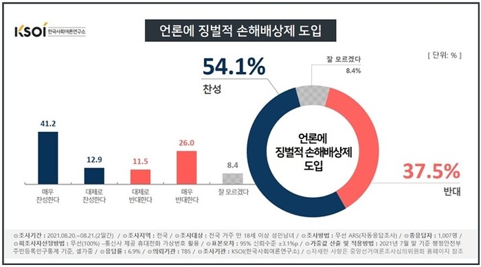 -국민 과반54.1% 언론에 대한 징벌적 손해배상제 도입 찬성 여론조사 결과나옴.