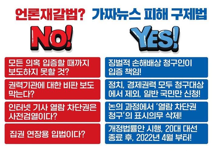 대통령, 총리, 장관, 국회의원, 판검사 등은 언론중재법상 피해구제대상이 아니다. 적용시기도 대선 이후다. 그런데 어찌 이 법이 권력비리를 은폐하고 집권연장을 위한 법이 되는가?