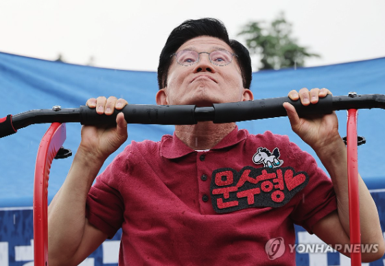 | ▲ 국민의힘 김문수 대선 후보가 28일 경북 경산시 영남대학교를 방문해 축제 현장에서 턱걸이를 선보이고 있다. 2025.5.28 (사진=연합뉴스) |