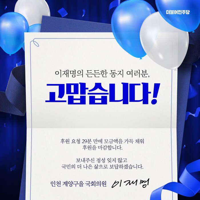 더불어민주당 이재명 당 대표의 후원회가 계좌를 연지 29분만에 마감됐다.