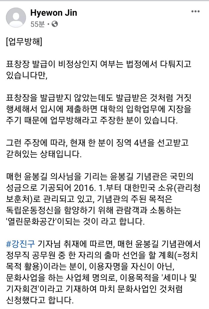 또, 진혜원 검사는 트위터에 ”윤봉길 의사 기념관 대여” 에 관하여 “업무방해”라고 하였다.