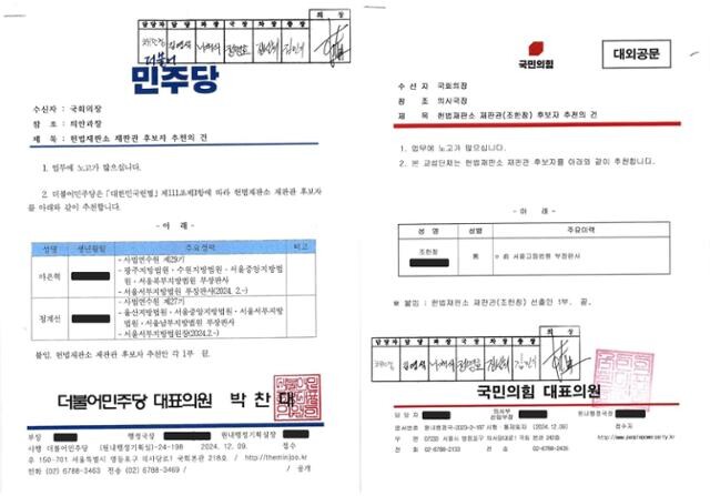 | ▲ 지난해 12월 9일, 더불어민주당과 국민의힘이 국회의장에게 제출한 헌법재판관 '추천 공문' (제공=국회의장실) |