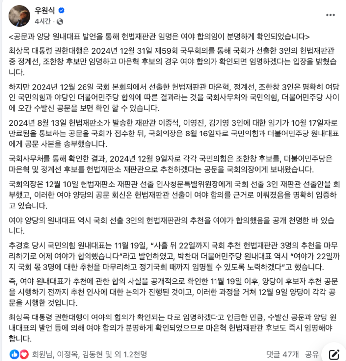여야 협의를 강조한 양당 원내대표의 발언도 소개했다. 추경호 당시 국민의힘 원내대표는 "(지난해 11월) 22일까지 국회 추천 헌법재판관 3명의 추천을 마무리하기로 여야가 합의했다"고 했고, 박찬대 민주당 원내대표도 "22일까지 추천을 마무리하고 정기국회 때까지 임명할 수 있도록 노력하겠다"고 호응한 것만 봐도 여야가 합의했다는 근거를 뒷받침한다는 것이다. 우 의장은 "최 대행이 여야 합의가 확인되는 대로 임명하겠다고 언급하지 않았느냐"며 "공문 등으로 분명히 확인됐으니 마 후보자도 즉시 임명하라"고 강조했다.