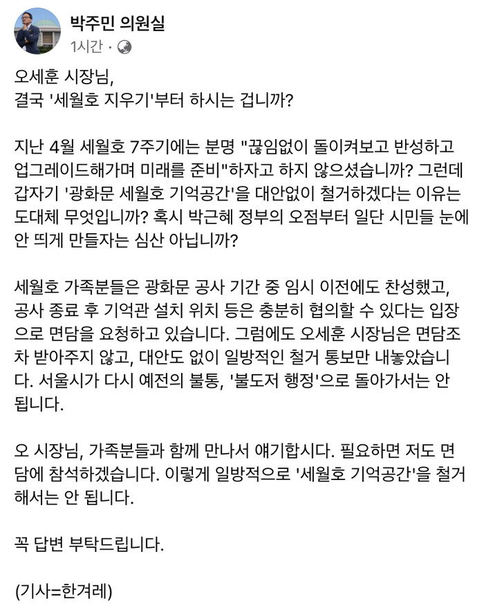 오세훈 시장님, 결국 "세월호 지우기" 하시는 겁니까?