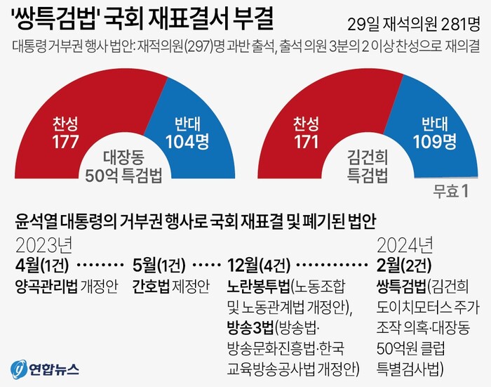 | ▲쌍특검법 부결 및 거부권 행사로 폐기된 법안 정리 (이미지=연합뉴스) |