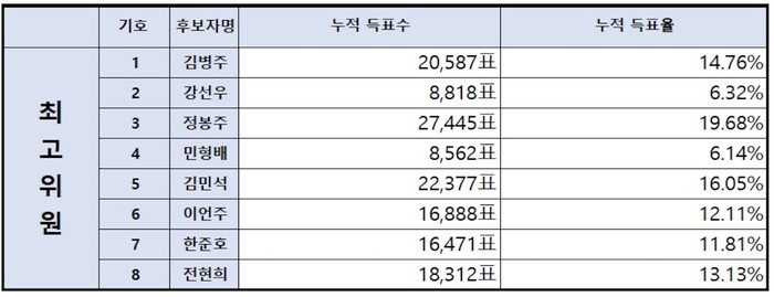 | ▲2주차 누적 최고위원 득표수 및 득표율 화면 캡쳐 |