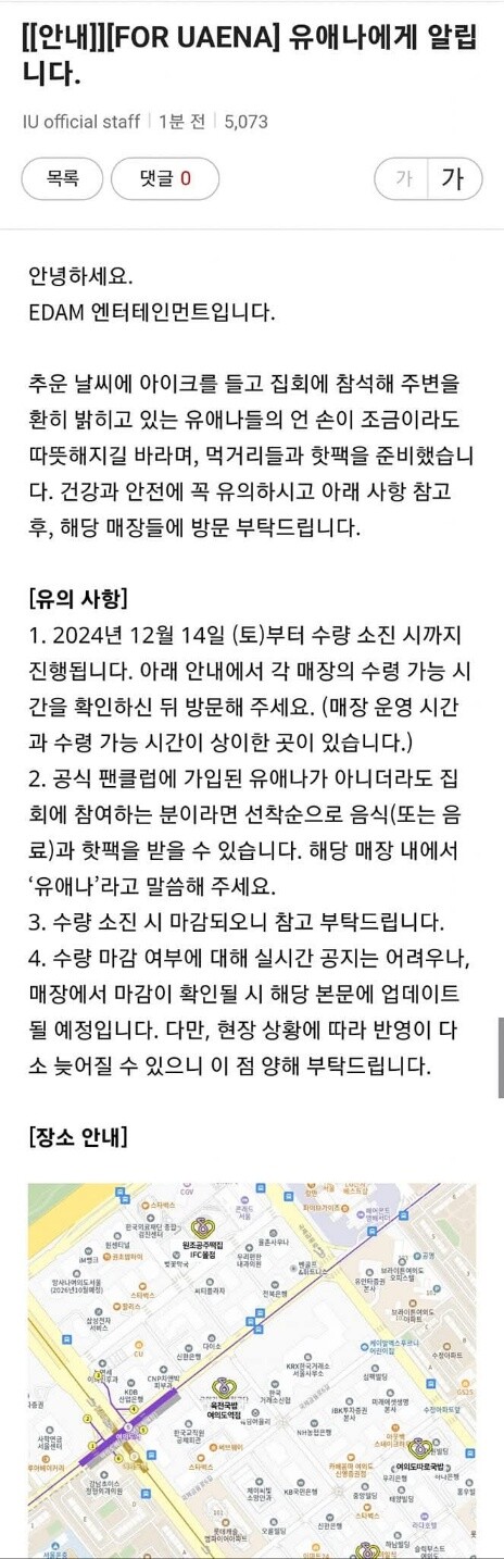 | ▲ 14일 집회에 물품을 후원한 아이유 소속사 공지글 |
