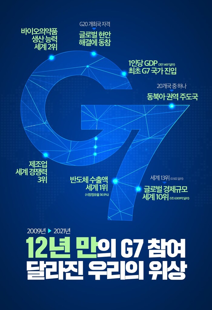 문재인 대통령은 영국 콘월에서 개최되는 G7 정상회의 참석을 위해 출국을 앞두고 있다. 2009년 이탈리아 G7 정상회의 이후 12년 만에 참석하는 이번 회의는 G7 국가들과 어깨를 나란히 할 정도로 높아진 우리의 위상을 보여주고 있다.