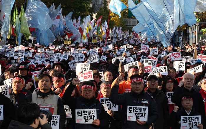 11일 양대 노총이 서울 도심에서 대규모 집회를 열고 윤석열 정부의 노동 정책을 규탄하는 한편 '노란봉투법'(노동조합 및 노동관계법 개정안)의 즉각 공포·시행을 촉구했다.