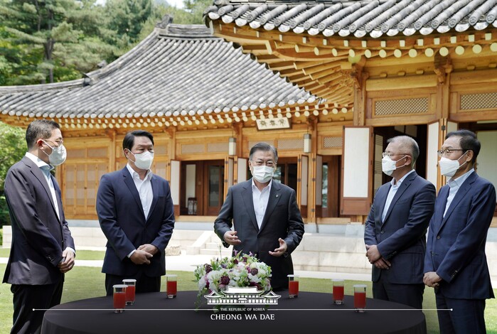 문재인 대통령은 오늘 정오부터 1시간 30분 동안 청와대 상춘재에서 4대 그룹 대표를 초청, 오찬을 겸한 간담회를 가졌다. 기업 측에서 김기남 삼성전자 부회장, 정의선 현대자동차 회장, 최태원 SK 회장, 구광모 LG 회장이 참석했다.