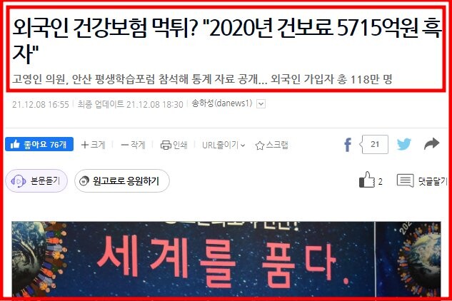 건강보험공단에 따르면 지난 2020년 기준 국내에 거주하는 약 118만 명의 외국인은 월 평균10만5123원, 총 1조 4915억원을 건보료를 납부하여 급여비 9200억원을 공제하고도 무려 5715억원이나 건보 재정을 플러스시켰다.