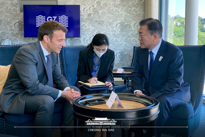 G7 정상회의 참석차 영국을 방문 중인 문재인 대통령은 13일 오전(현지시각) 카비스 베이 정상회담 라운지에서 마크롱 프랑스 대통령과 '약식회담(pull aside)'을 가졌다. 양 정상은 코로나 19 방역 및 경제 상황을 공유했으며, 마크롱 대통령은 한국의 빠른 경제 회복을 높이 평가했다.
