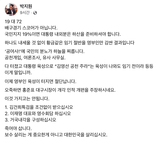 그는 홍준표 대구시장이 개각과 인적 개편을 주장하는 것을 언급하며, "이것 가지고는 안된다. 1. 김건희특검을 조건없이 받으라. 2. 이재명 대표와 영수회담 하라. 3. 거국내각을 구성하라"고 주문했다.