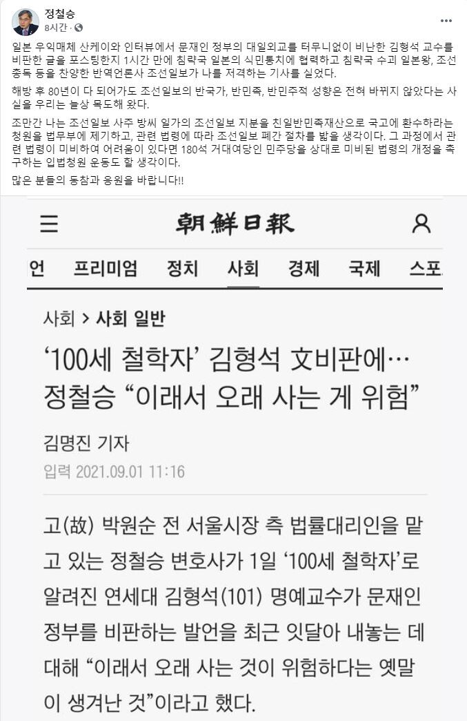 일본 우익매체 산케이와 인터뷰에서 문재인 정부의 대일외교를 터무니없이 비난한 김형석 교수를 비판한 글을 포스팅한지 1시간 만에 침략국 일본의 식민통치에 협력하고 침략국 수괴 일본왕, 조선총독 등을 찬양한 반역언론사 조선일보가 나를 저격하는 기사를 실었다.
