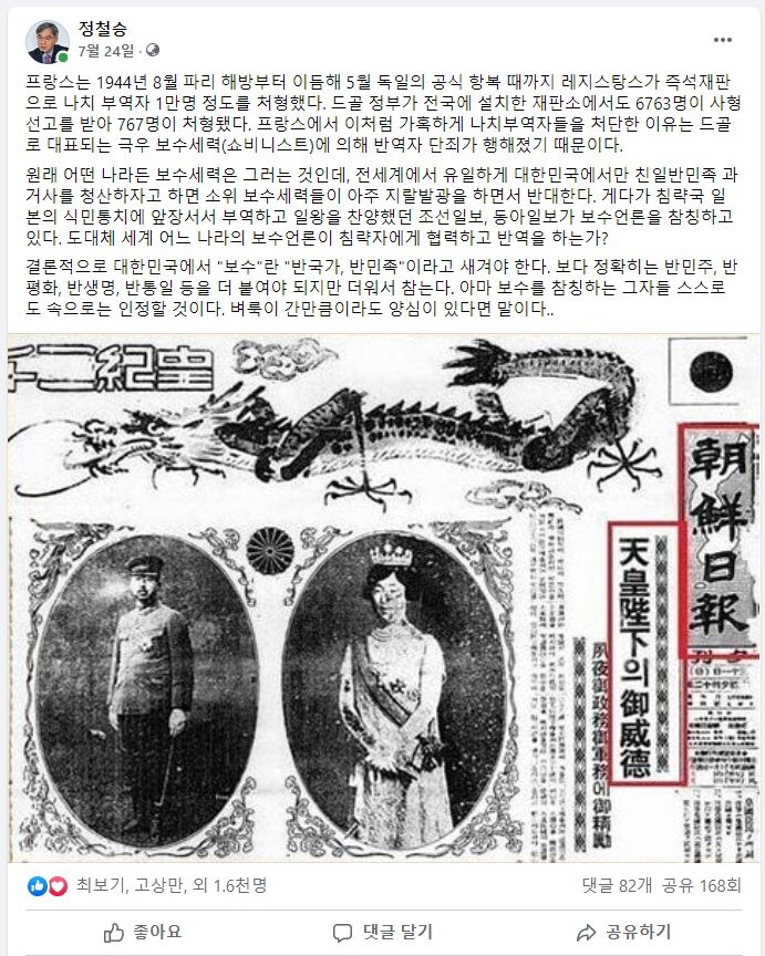 조선일보는 일제강점기에 침략국 일본의 식민통치에 앞장서서 부역하고 침략국 수괴인 일왕을 찬양했던 명백한 반역행위를 저질렀다. 무려 20년 동안이나.. 우리가 문명국가라면 1945년 해방 직후에 조선일보는 폐간되고 모든 재산은 몰수당하고 사주 및 간부들은 사형 등 중형에 처해지고 조선일보 사주일가와 종사자들은 언론계 퇴출은 물론이고 공민권까지 박탈당했어야 했다.
