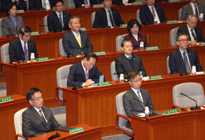 | ▲ 29일, 예결위 전체회의에서 최상목 부총리 겸 기재부 장관 등이 굳은 표정을 짓고 있다. (사진=연합뉴스) |