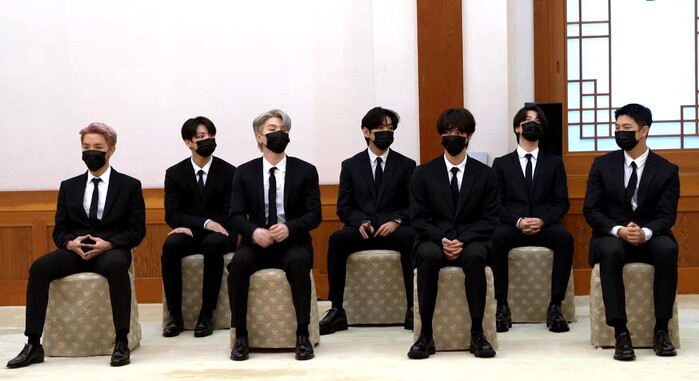 문 대통령은 “최근에 ‘Butter’가 빌보드 차트에 역주행해서 다시 1위를 탈환한 것을 축하한다”며 ‘Permission to Dance’ 안무 속에 수화 안무를 포함시켜 세계의 청각장애인들에게 큰 희망을 준 것에 대해서도 언급했다.